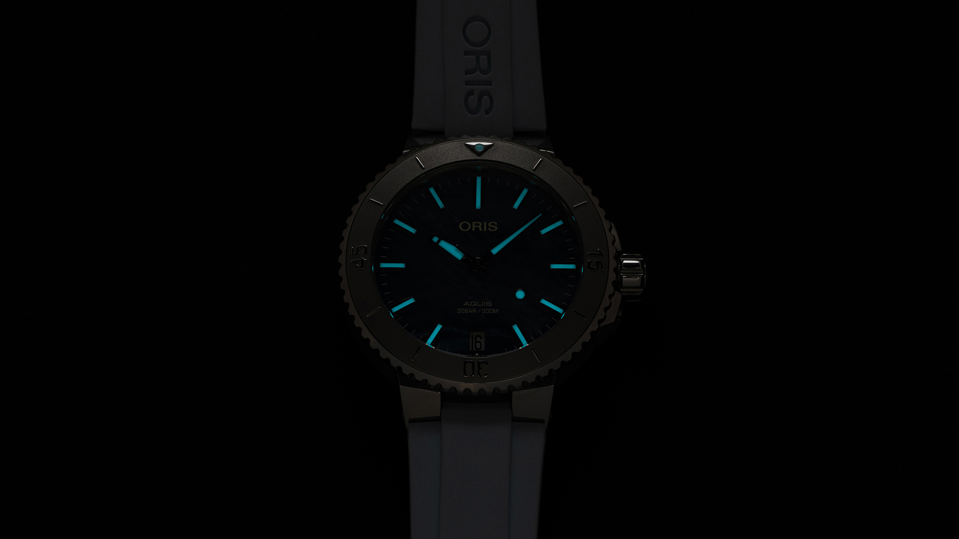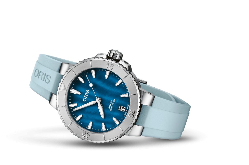 Die aus Perlmutt gefertigten Zifferblätter schimmern im Licht wie die Wasseroberfläche bei Sonnenuntergang und verleihen dem Hochleistungsprofil der Aquis einen eleganten, raffinierten Farbton.