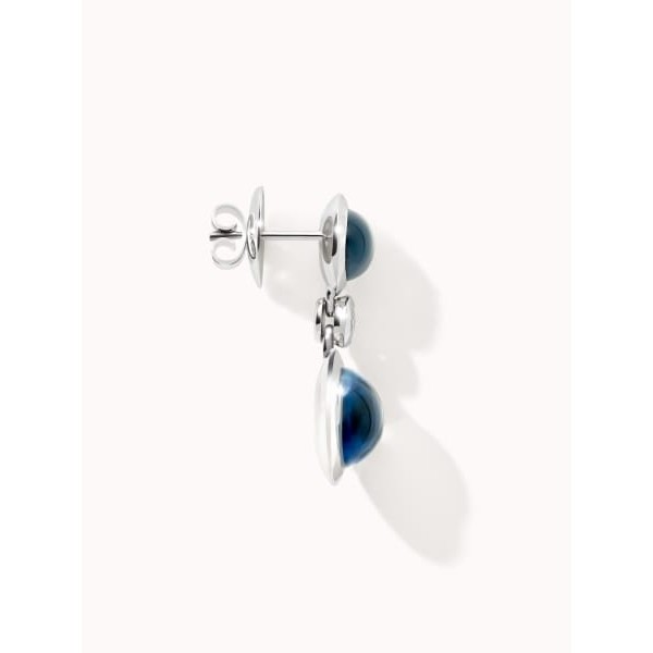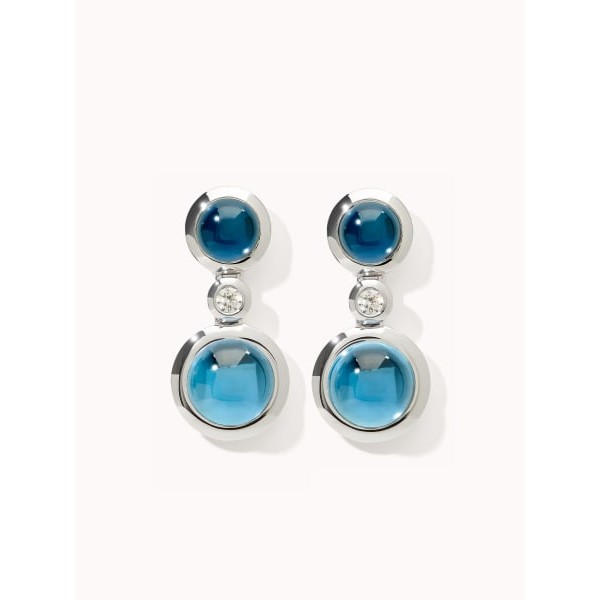 Die BOUTON 2 Cabochon Ohrringe* in der strahlenden Color Story Sky bestechen durch leuchtend blaue Topase. Verbunden durch einen weißen Diamanten, bewegen sich die größeren Cabochons sanft unter dem Ohrläppchen und garantieren so wunderbare Tragbarkeit.