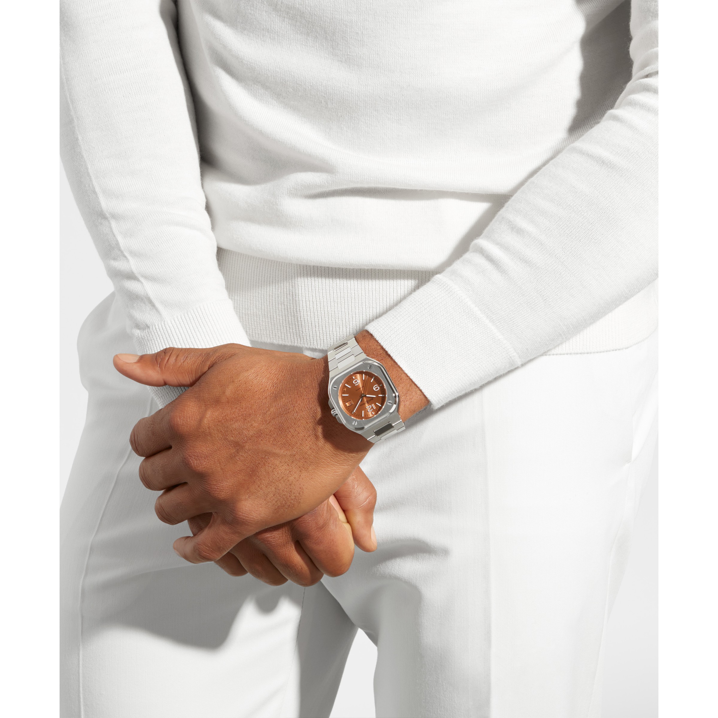 Die BR 05 Copper Brown ist Teil der Dreizeigeruhr BR 05 von Bell & Ross. Die BR 05 greift das berühmte quadratische Gehäuse mit runder Öffnung und Schrauben an den vier Ecken des ikonischen Designs der BR 03 wieder auf. Die Linien werden weicher, die Winkel runder und die Abmessungen kleiner. Die BR 05 ist weniger extrem, mehr Mainstream und lässt sich leichter als tägliches Accessoire tragen. Grafisch und stilvoll, ist sie ein durchschlagender Erfolg. Sie ist zur zweiten Ikone von Bell & Ross geworden. Konzipiert für das Stadtleben, ist sie der ideale Begleiter für urbane Abenteurer.