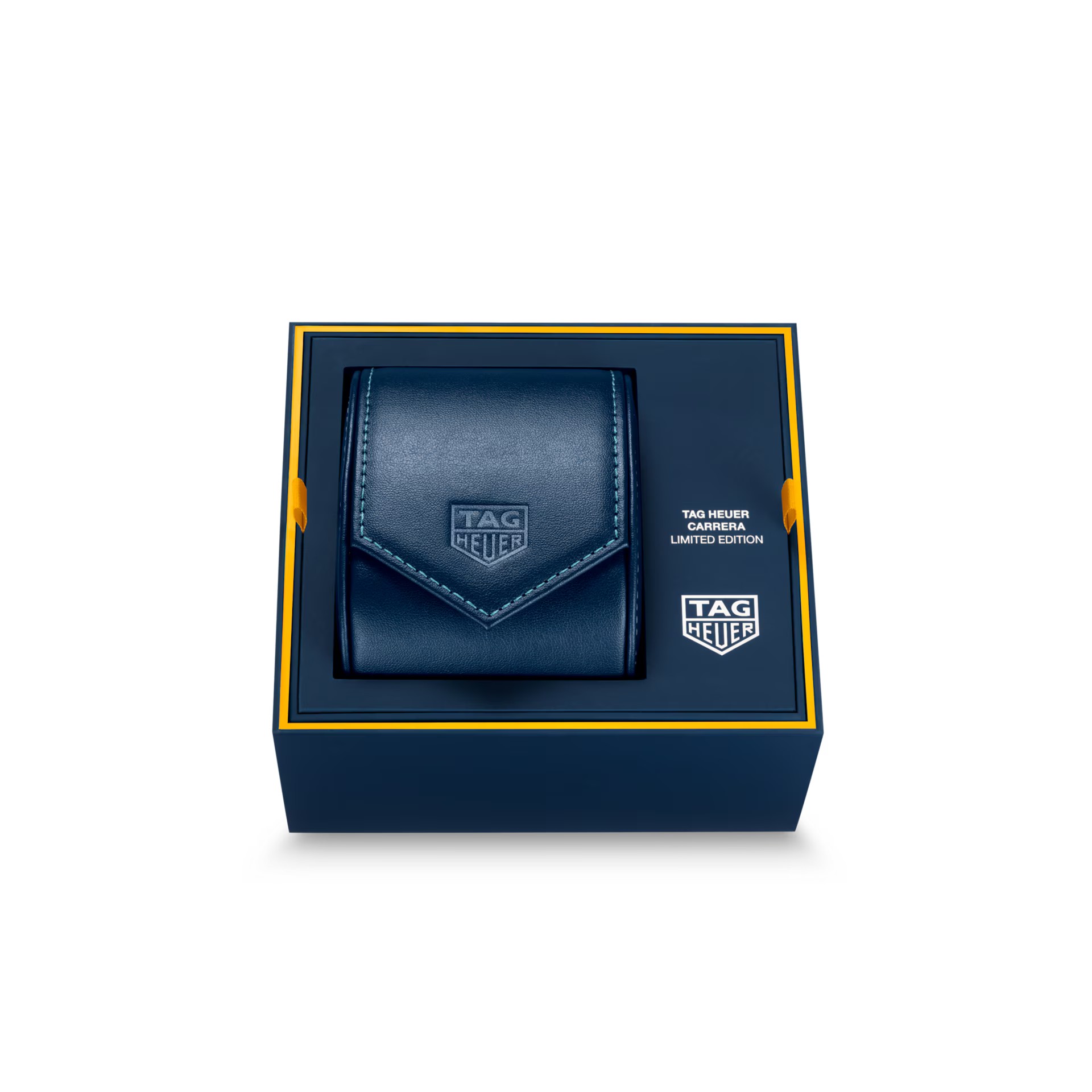 Eine exklusive, dunkelblaue Präsentationsbox mit hellen gelben Akzenten und ein spezielles Reiseetui mit blauen Nähten spiegeln den kühnen Charakter des Zeitmessers wider – ideal für alle bevorstehenden Abenteuer. Modern und zeitlos zugleich, ganz im Einklang mit der dynamischen Energie der Carrera.