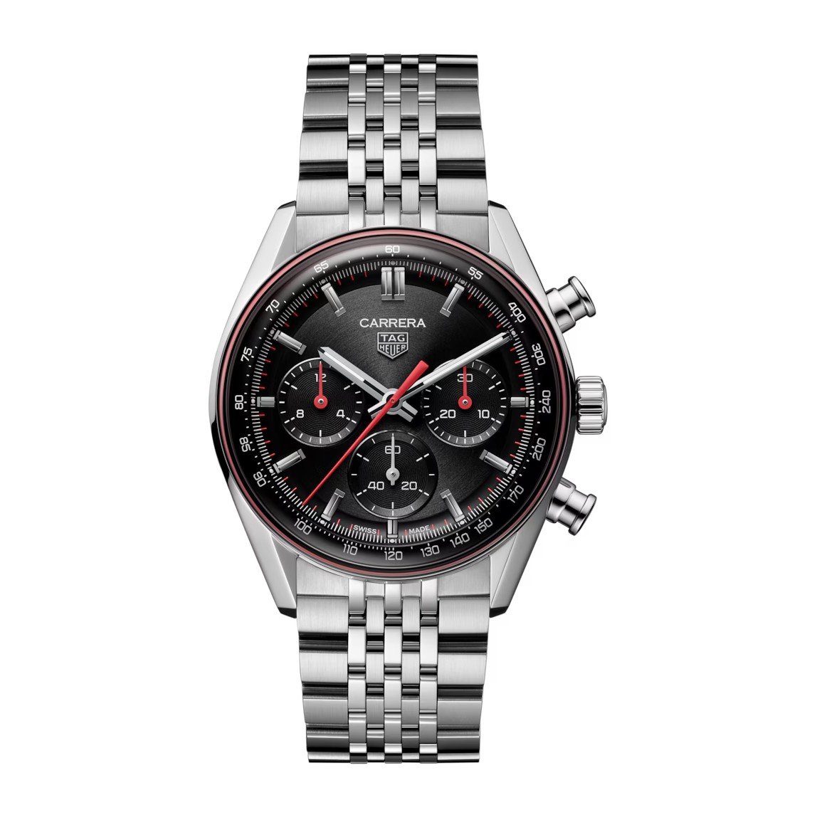 Das Tricompax-Layout, das durch rot lackierte Chronographenzeiger ergänzt wird, verspricht eine optimale Ablesbarkeit. Unter dem charakteristischen Saphirglas und dem 3D-Zifferblattring umrahmen das schwarze, kreisförmig gebürstete Zifferblatt und die Tachymeterskala die azurierten Zähler mit Tiefe und Klarheit. Jedes Detail fängt den Nervenkitzel des Rennens ein.