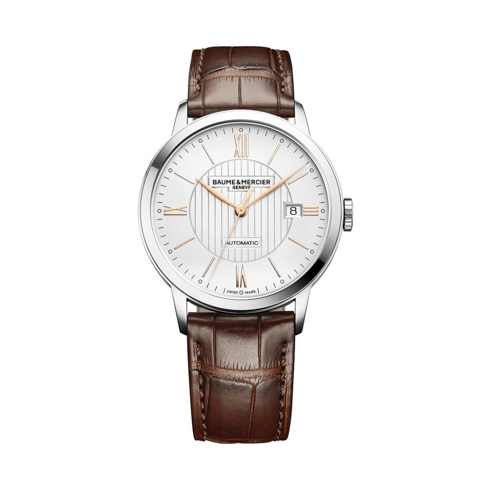 Konzipiert mit klaren Linien und unauffälliger Eleganz, ist diese Selbstaufzugsuhr für Herren perfekt für den modernen Gentleman. Sie verfügt über ein rundes Edelstahlgehäuse mit einem Durchmesser von 40 mm und Römischen Ziffern für die Stundenmarkierung. Goldene Stunden-, Minuten und Sekundenzeiger gleiten über das Zifferblatt mit dekorierter Linien-Guillochierung in der Mitte. Eine Datumsöffnung befindet sich bei 3 Uhr. Um das klassische Gefühl dieses kultigen Zeitmessers zu unterstreichen, passt sich das braune Lederarmband nahtlos an das Edelstahlgehäuse an. Der Gehäuseboden ist aus kratzfestem Saphirglas.