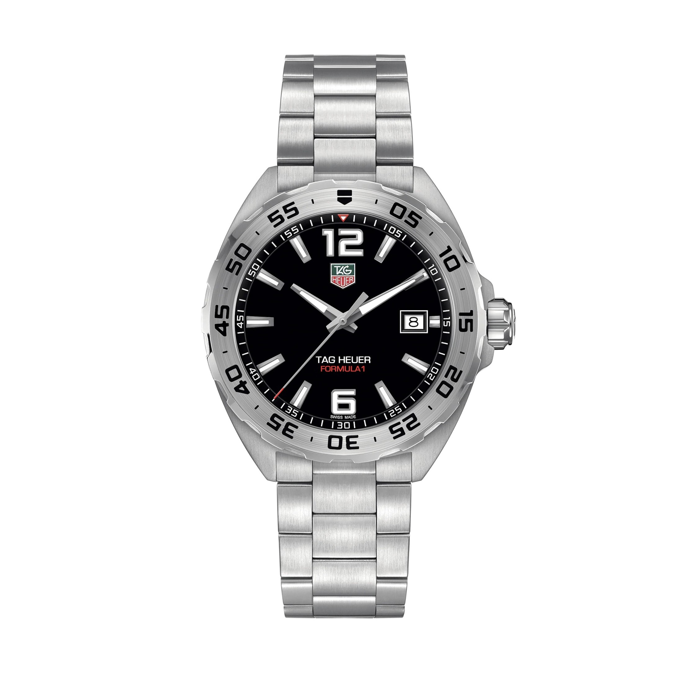 Eine schwarze Sportuhr mit 41-mm-Gehäuse aus Edelstahl, dreireihigem Armband aus Edelstahl und einseitig drehbarer Lünette mit 60-Minuten-Skala. Ein Sekundenzeiger mit roter Spitze und dem legendären weiß-rot-grünen TAG Heuer Logo verleihen dem sehr gut ablesbaren Zifferblatt ein markantes Design.