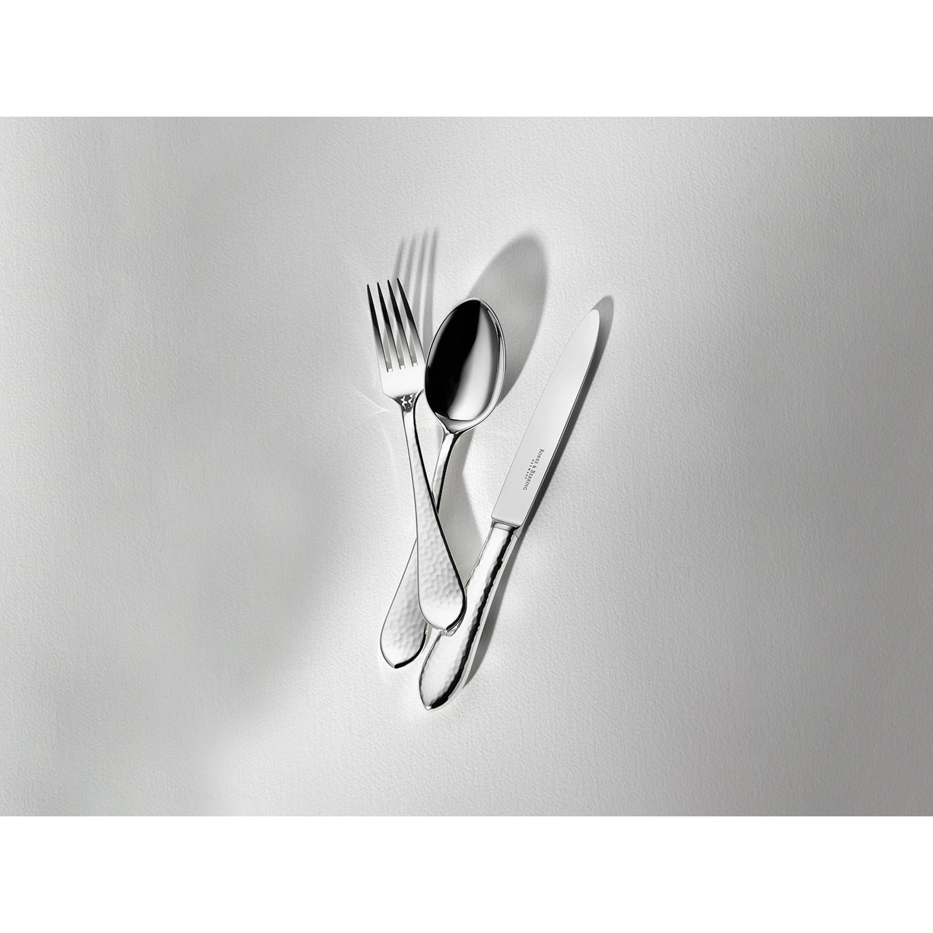 Die Martelé Menügabel wird bei Robbe & Berking mit besonders viel Liebe zum Detail gefertigt: Selbst die Innenseiten der Zinken werden von Hand glänzend poliert, sodass sich die Gabel besonders angenehm im Mund anfühlt und der einzigartige Glanz des Silbers sich in jedem Millimeter des Besteckstücks widerspiegelt. Bestecke in Menügröße sind kleiner und handlicher als das festliche Tafelbesteck, aber größer als das Vorspeisen- und Dessertbesteck. Es eignet sich damit hervorragend für den alltäglichen Gebrauch.