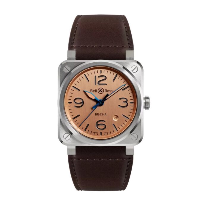 BR03A-GB-ST/SCA Die Kollektion BR 03 verkörpert die Identität des Hauses und symbolisiert seinen Stil mit dem ikonischen Design des „Runden im Quadrat mit vier Schrauben“. Die neue BR 03 bleibt ihren Identitätscodes treu und entwickelt sich mit einem leicht verkleinerten Format und einer Gangreserve von 54 Stunden dank des Kalibers der neuesten Generation, dem BR CAL.302, weiter.