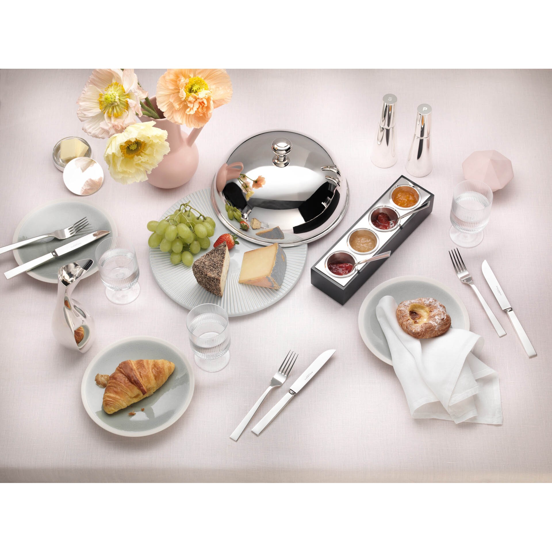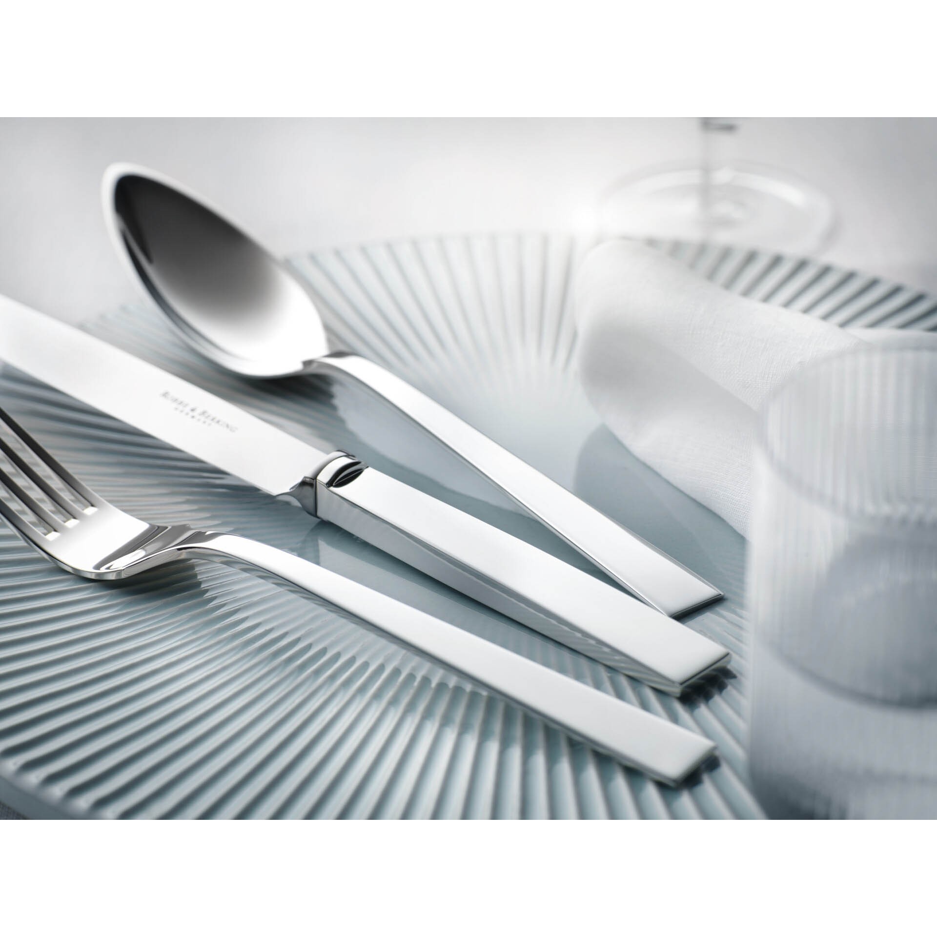 Der Riva Menülöffel von Robbe & Berking liegt perfekt austariert in der Hand und gehört zu den Basisstücken eines jeden Bestecksets. Die Laffe des Menülöffels wird mit besonderer Sorgfalt bearbeitet, um ein umschmeichelndes Gefühl im Mund zu ermöglichen. So manche Köche haben schon ganze Löffelmenüs für die Robbe & Berking Menülöffel gezaubert, denn bewusste Genießer werden den Unterschied im Mund wahrnehmen. Bestecke in Menügröße sind kleiner und handlicher als das festliche Tafelbesteck, aber größer als das Vorspeisen- und Dessertbesteck. Es eignet sich damit hervorragend für den alltäglichen Gebrauch.