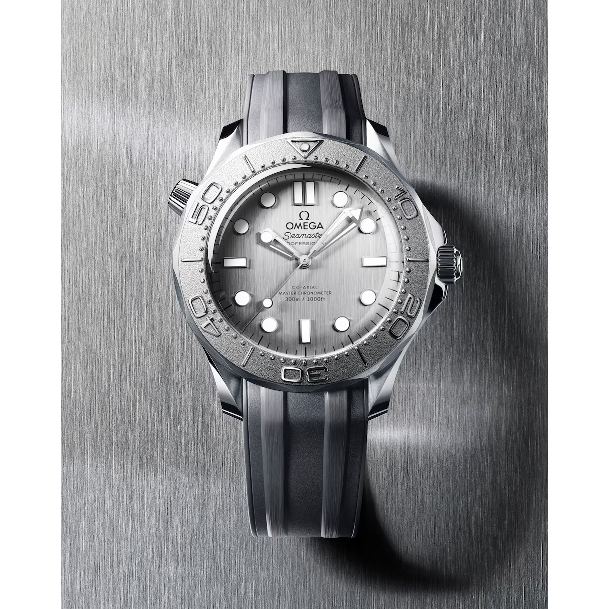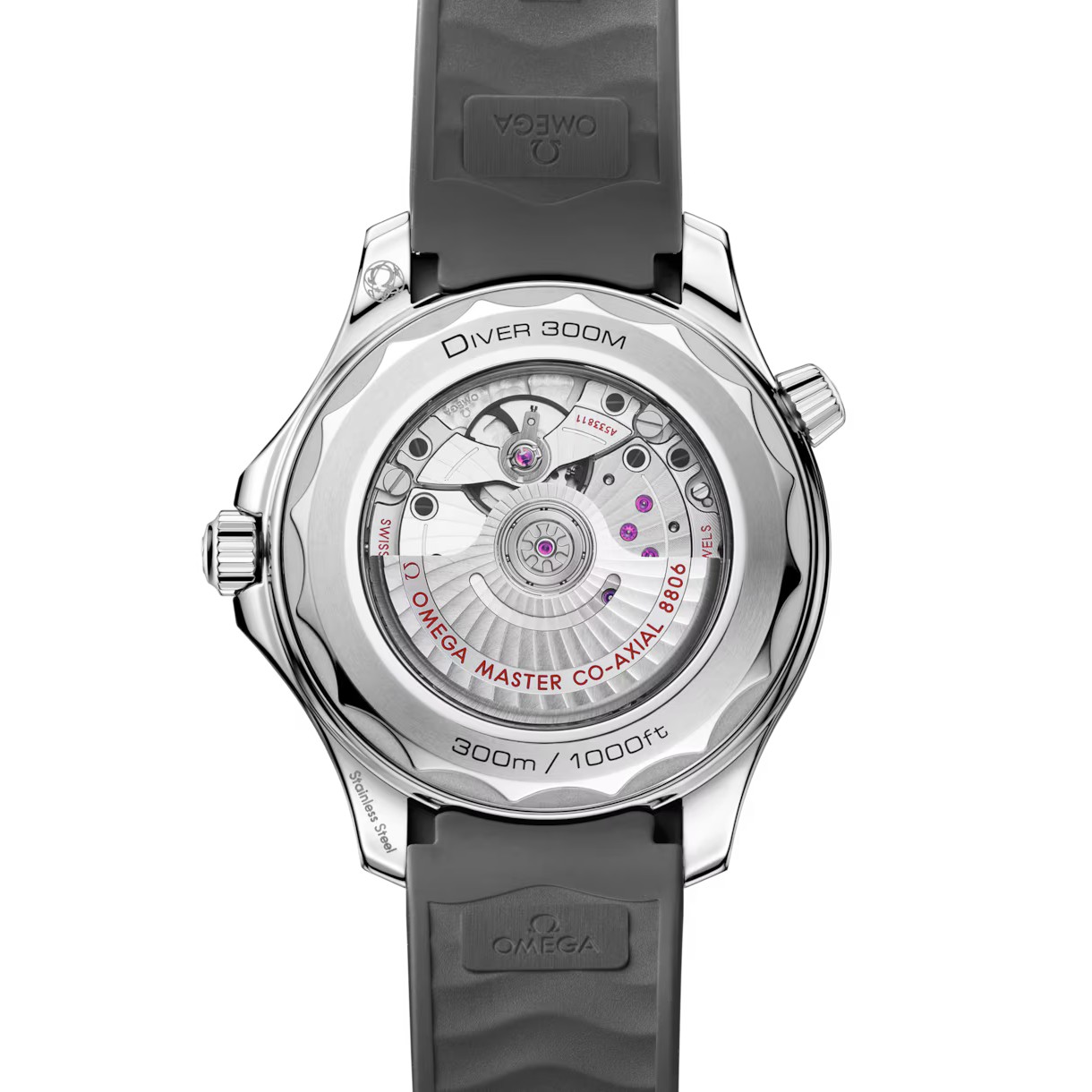 Am Handgelenk gehalten wird die Uhr von einem integrierten grauen Kautschukarmband mit Faltschließe, für den Antrieb sorgt das OMEGA Co-Axial Master Chronometer Kaliber 8806, das durch den Saphirglasboden bewundert werden kann.