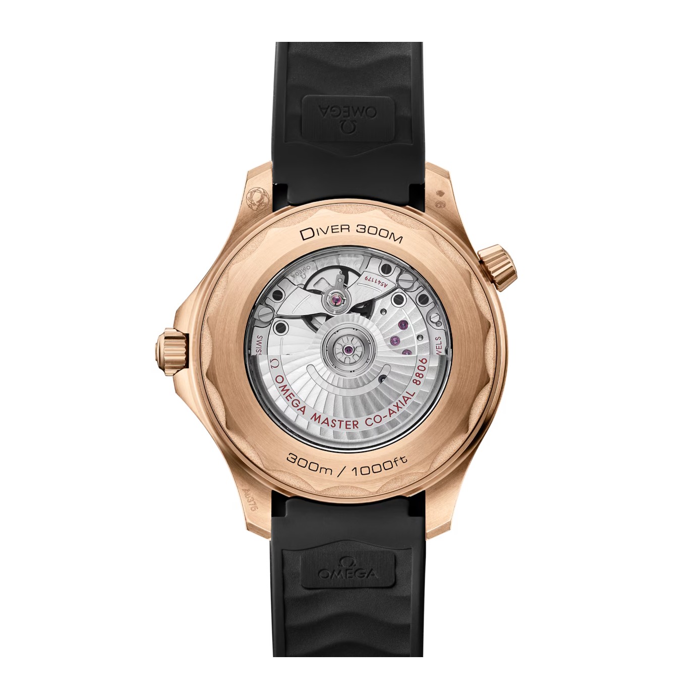 Am Handgelenk gehalten wird die Uhr von einem integrierten schwarzen Kautschukarmband mit Schließe, für den Antrieb sorgt das OMEGA Co-Axial Master Chronometer Kaliber 8806, das durch den Saphirglasboden bewundert werden kann.
