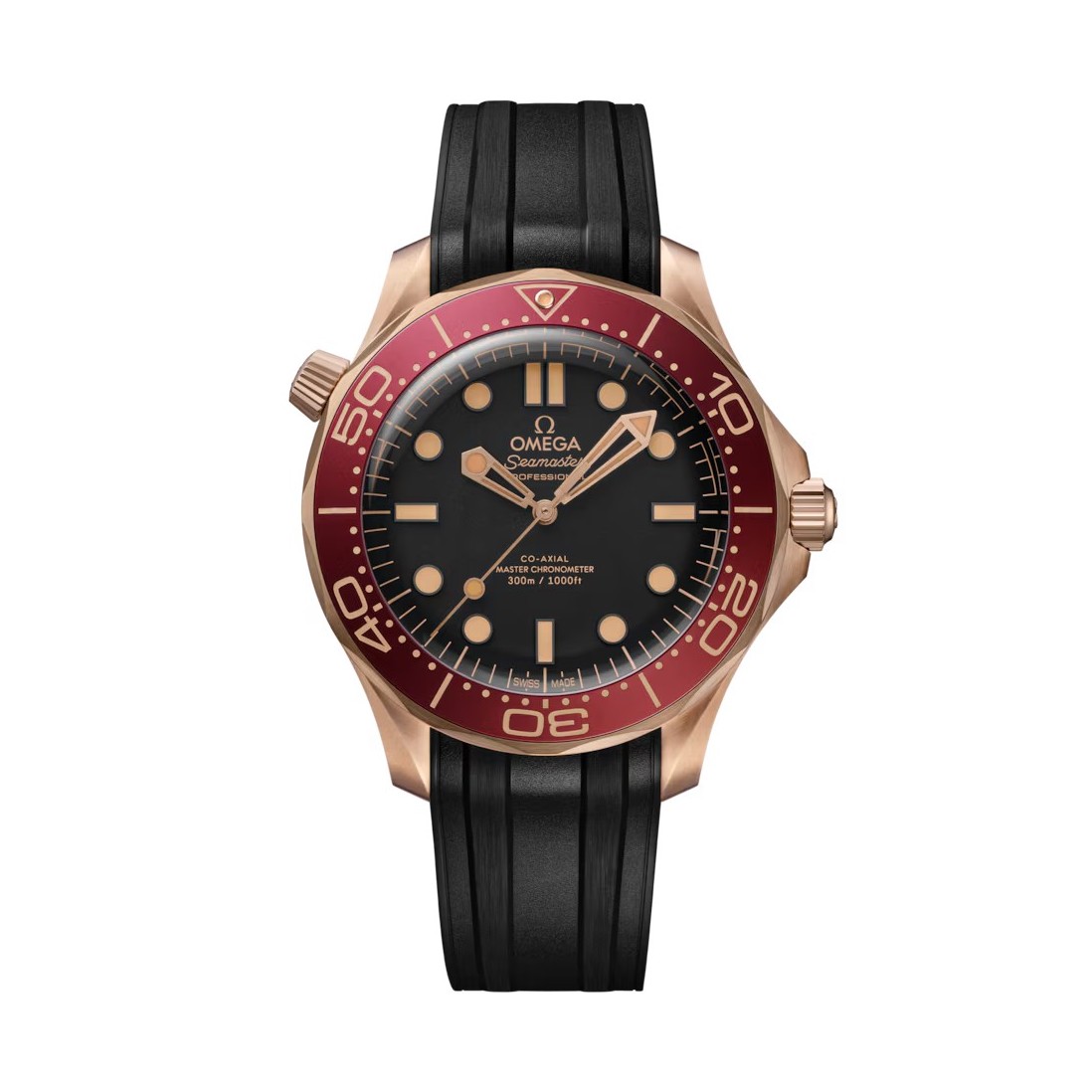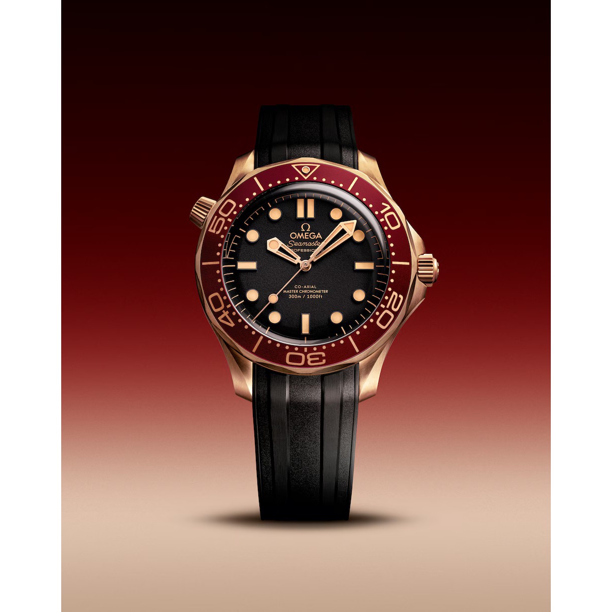 Das 42-mm-Gehäuse aus OMEGAs exklusivem Bronze-Gold verfügt über einen burgunderroten, mit Oxalsäure eloxierten Lünettenring aus Aluminium, der eine Tauchskala aus Vintage-Super-LumiNova aufweist.