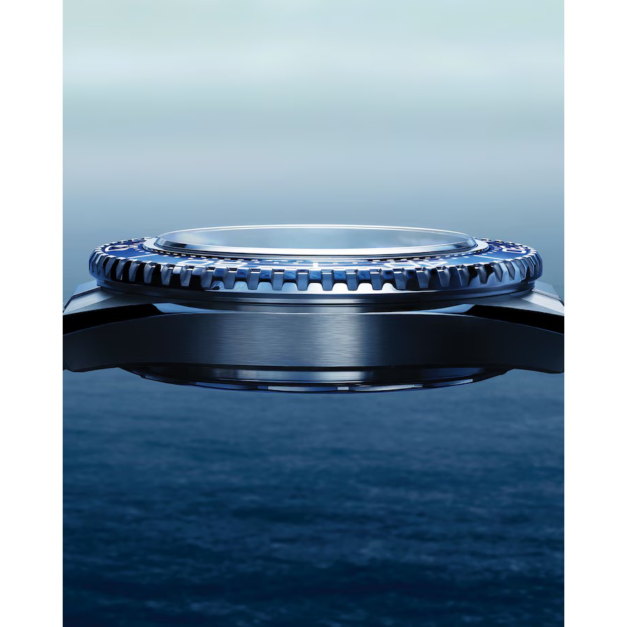 Dieses 42 mm Modell ist mit einem Gehäuse aus poliertem und gebürstetem Edelstahl gefertigt. Die Uhr verfügt über einen Lünettenring aus polierter blauer Keramik mit einer Taucherskala aus weißer Emaille, der innere Ring besteht aus poliertem Titan Grad 5.