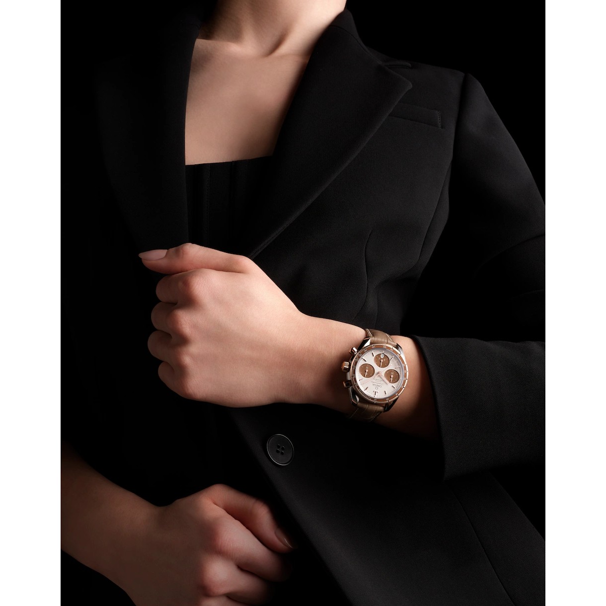 Das „Cappuccino“-Zifferblatt ist mit horizontal ausgerichteten braunen ovalen Hilfszifferblättern und einem vertikal ausgerichteten ovalen Datumsfenster bei 6 Uhr bestückt. Während die Indizes und Zeiger aus 18 K SednaT-Gold bestehen, sind der Stunden-, Minuten- und Chronographensekundenzeiger mit weißer Super-LumiNova beschichtet.