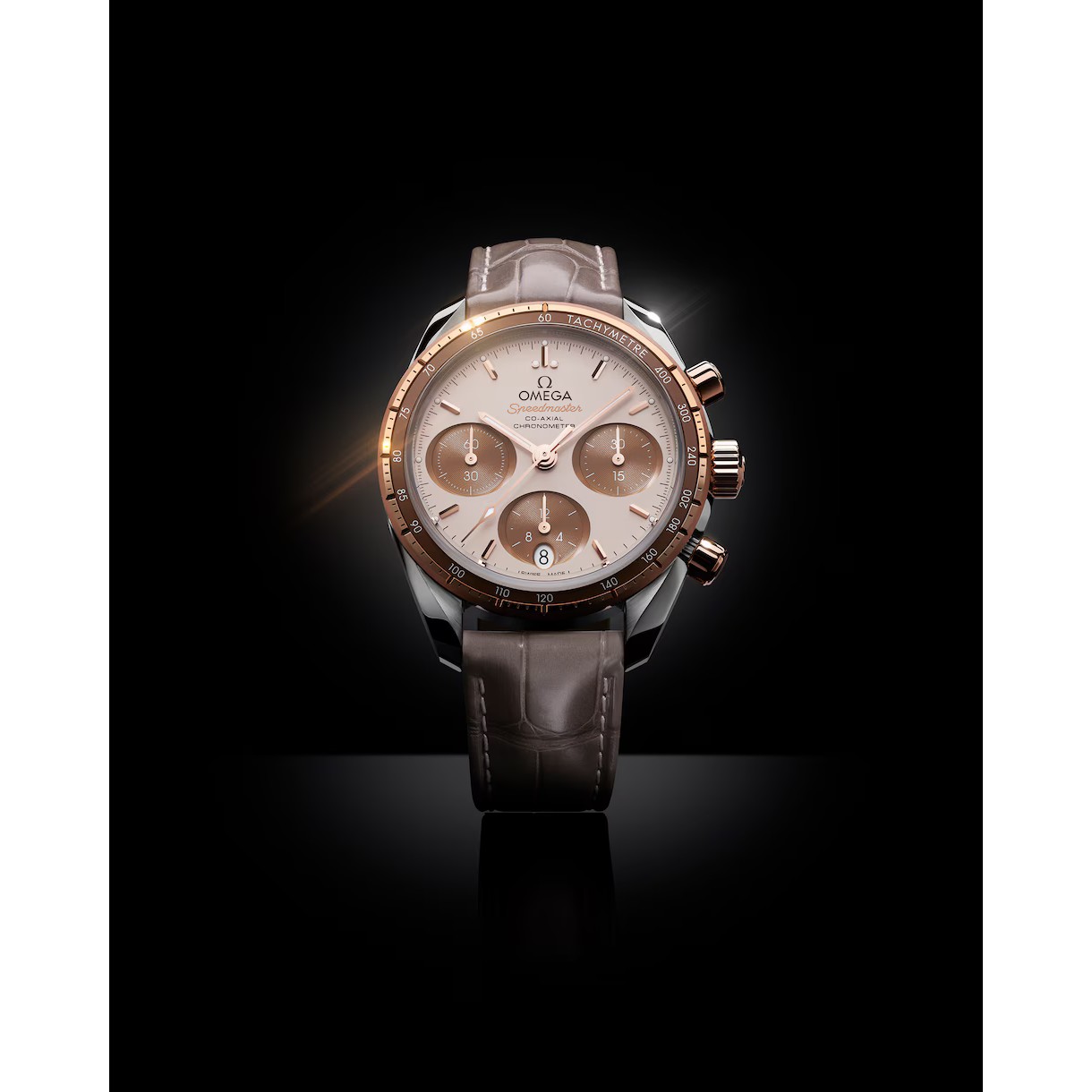 Auch wenn sich die Speedmaster 38 mm-Kollektion in ästhetischer Hinsicht an einer bestimmten Form von Schlichtheit, Größe und Farbe orientiert, bleibt sie dem Erscheinungsbild und uhrmacherischen Erbe von OMEGAs berühmtestem Chronographen treu.
