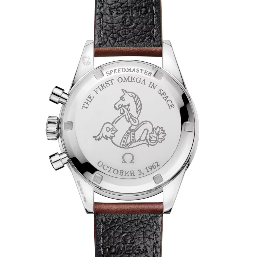 Auf dem Zifferblatt und der Krone ist ein OMEGA Vintage-Logo zu sehen, während der Gehäuseboden mit dem berühmten Seepferdchen-Medaillon und den Gravuren „THE FIRST OMEGA IN SPACE“ und „OCTOBER 3, 1962“ versehen ist.