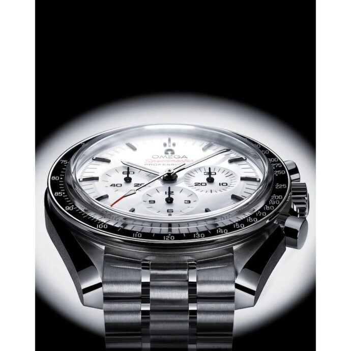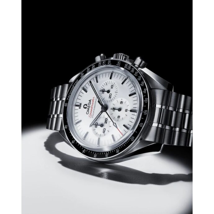 Diese 42-mm-Moonwatch aus Edelstahl wird von einem polierten und gebürsteten Metallarmband am Handgelenk gehalten. Als Uhrglas und Gehäuseboden dient Saphirglas. Inspiriert von der 4. Generation der Speedmaster, die auf dem Mond getragen wurde, besitzt das Modell auch ein asymmetrisches Gehäuse, ein weiß lackiertes, abgestuftes Zifferblatt mit appliziertem OMEGA Logo und applizierten Indizes, Zeiger im Moonwatch-Stil und den berühmten Punkt über der 90 auf dem Lünettenring aus schwarzem, eloxiertem Aluminium.