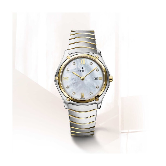 EBEL Sport Classic Uhr, Gehäuse aus Edelstahl & 18K Gelbgold, Ø 37 mm, Perlmuttzifferblatt mit applizierten römischen Ziffern und 8 Diamanten (0,104 Karat), innenseitig entspiegeltes Saphirglas, Wellengliederarmband aus Bicolor-Edelstahl mit Faltschließe, Schweizer Quarzwerk, wasserdicht bis 5 bar.