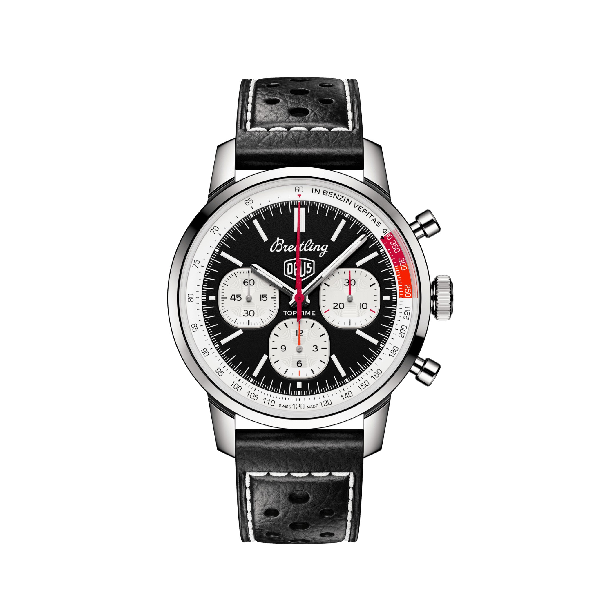 Die 1960er Jahre waren ein Jahrzehnt, das von Experimentierfreude, Spass, Freiheit und Energie geprägt war. Ob man mit einem Motorrad eine Spritztour machte oder in einem Sportwagen Gas gab, das Leben lief auf Hochtouren. Willy Breitling spürte diesen Tempowechsel und nahm sich vor, einen unkonventionellen Chronographen zu entwickeln, der den Schwung der Epoche einfing. Er nannte ihn die Top Time. Diese lebendige Tradition wird auch heute noch fortgesetzt, denn Breitling arbeitet bei der Entwicklung der Top Time mit einigen der angesagtesten Namen der Auto- und Motorradindustrie zusammen. Die gemeinsam mit dem australischen Surf- und Motorradausstatter Deus Ex Machina entwickelte Top Time B01 Deus wird Biker, Boarder und Rucksacktouristen ansprechen, die alle nach der Freiheit suchen, die Welt auf ihre eigene Weise und in ihrem eigenen Tempo zu erkunden. Sie verfügt über das Deus-Emblem und den Schriftzug «In benzin veritas» auf dem Zifferblatt sowie über ein perforiertes Lederarmband, eine Tachymeterskala und kontrastierende «Squircle»-Zifferblätter (nicht ganz quadratisch, nicht ganz rund), wodurch die besondere Atmosphäre eines klassischen Armaturenbretts erzeugt wird. Ausserdem verfügt sie über einen speziellen Chronographenzeiger in Form eines Blitzes und hat einen Motor unter der Haube, mit dem man sich sehen lassen kann: das aussergewöhnliche Breitling-Manufakturkaliber 01.