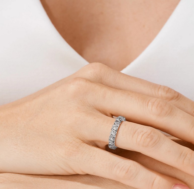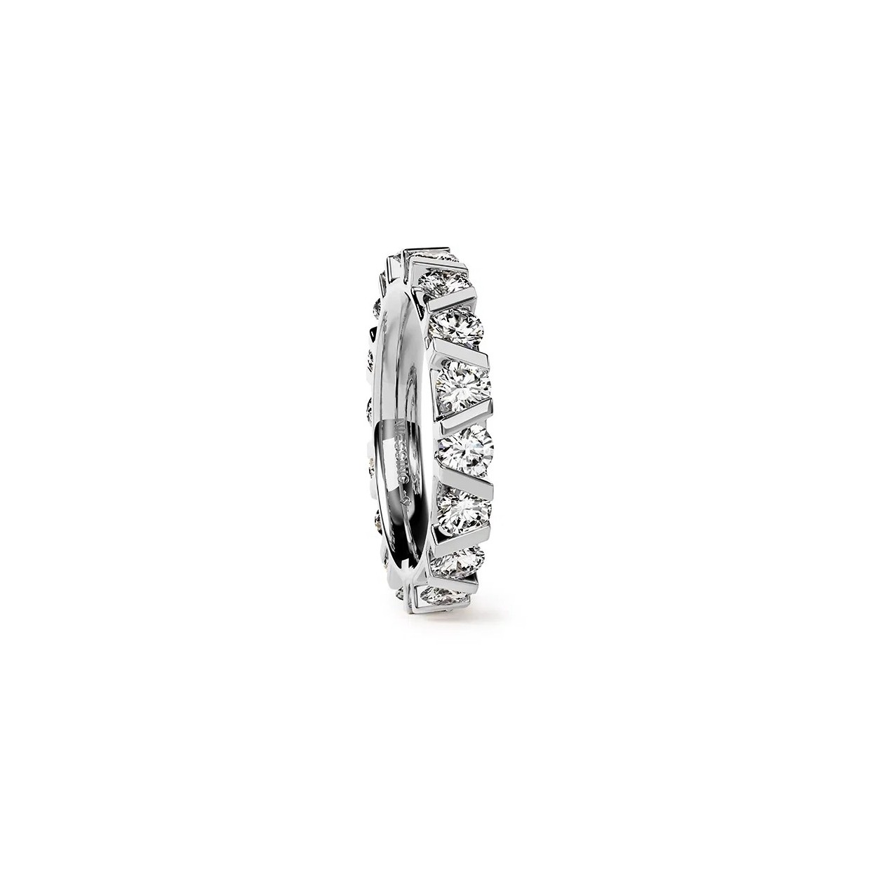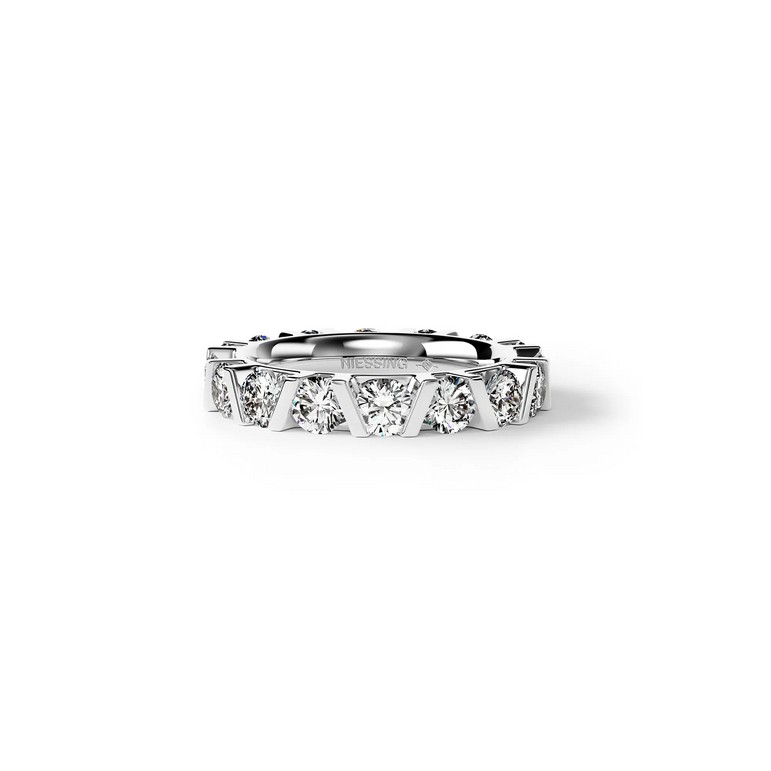 Sie sind wahre Meisterwerke des Designs, die durch ihre dynamische Anordnung der Diamanten bestechen. Die Diamanten in verschiedenen Größen und Fassungen sind rundherum kunstvoll in einer raffinierten Zick-Zack-Form angeordnet und verleihen ihnen so eine außergewöhnliche Strahlkraft. Diese innovative Fassung fängt nicht nur die Brillanz der Steine ein, sondern vermittelt auch ein Gefühl von Bewegung und Lebendigkeit. Das Spiel von Licht und Schatten, das durch die präzise Ausrichtung der Diamanten entsteht, verleiht den Ringen eine faszinierende Tiefe und Dynamik. Die klaren Linien und die minimalistische Ästhetik der Ringe betonen die pure Schönheit der Diamanten und verwandeln jedes Stück in ein einzigartiges Kunstwerk. Diese Ringe definieren Diamantschmuck neu und setzen ein starkes Design-Statement, das neue Maßstäbe in der Schmuckwelt setzt.