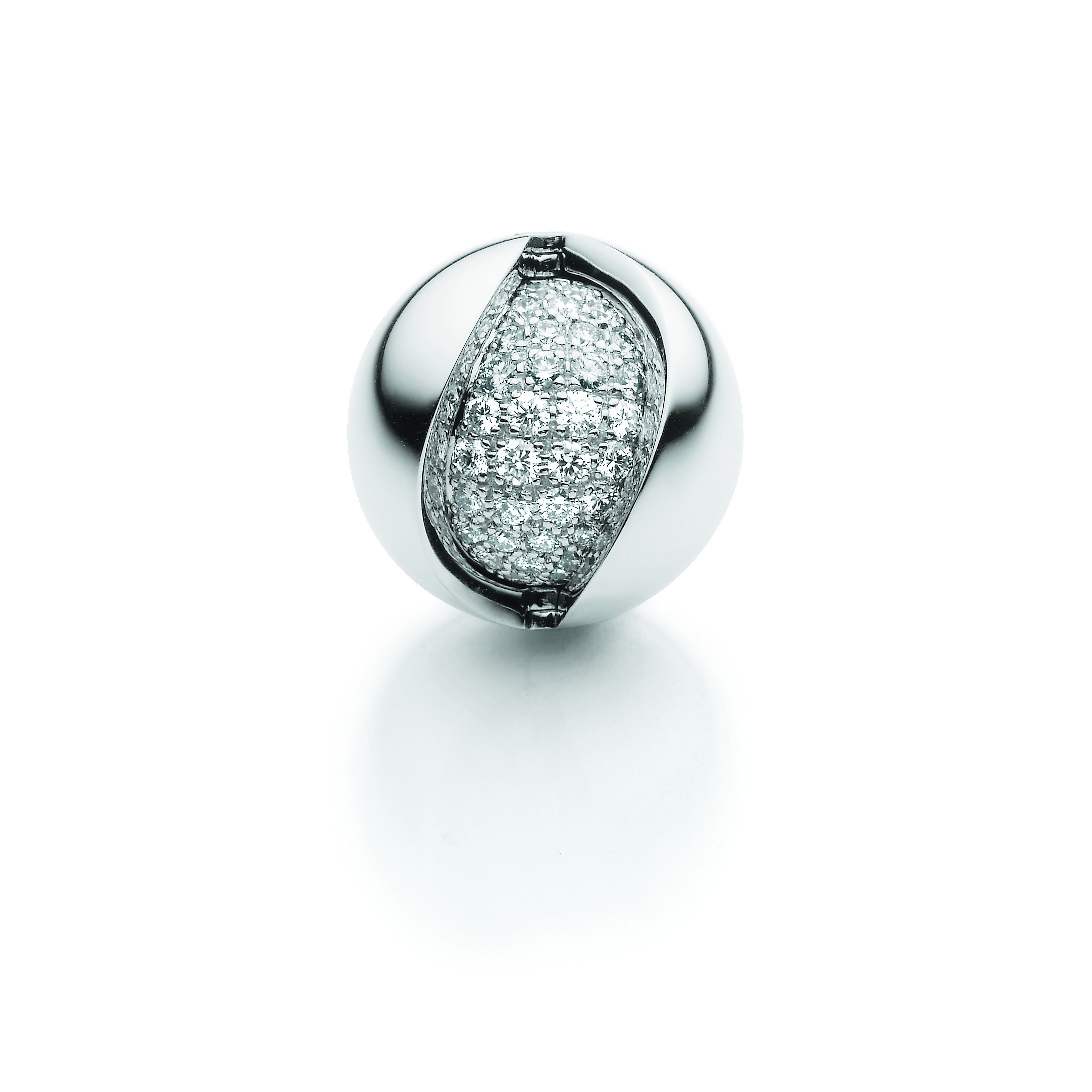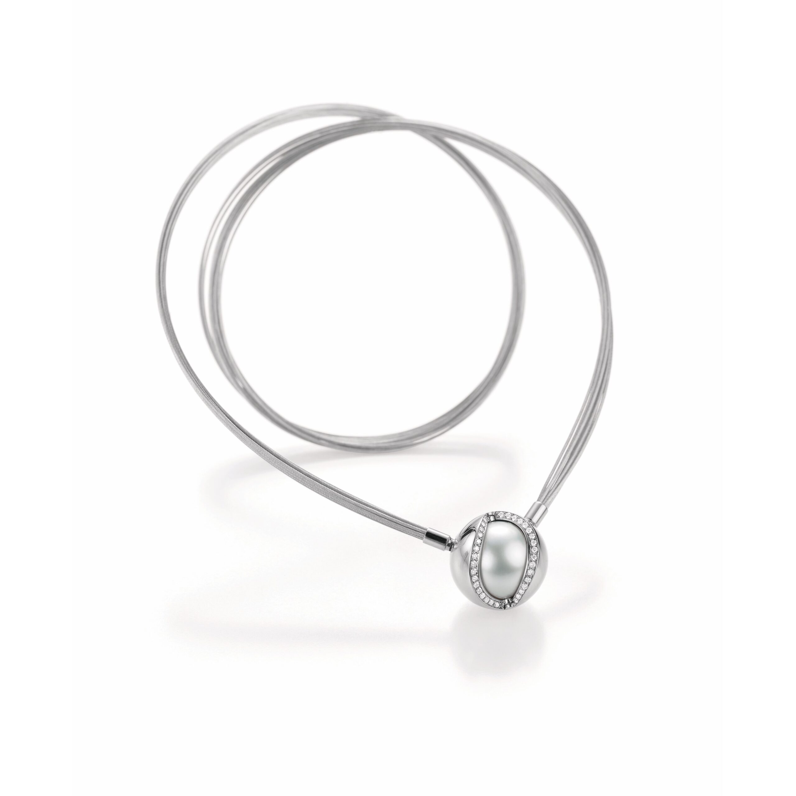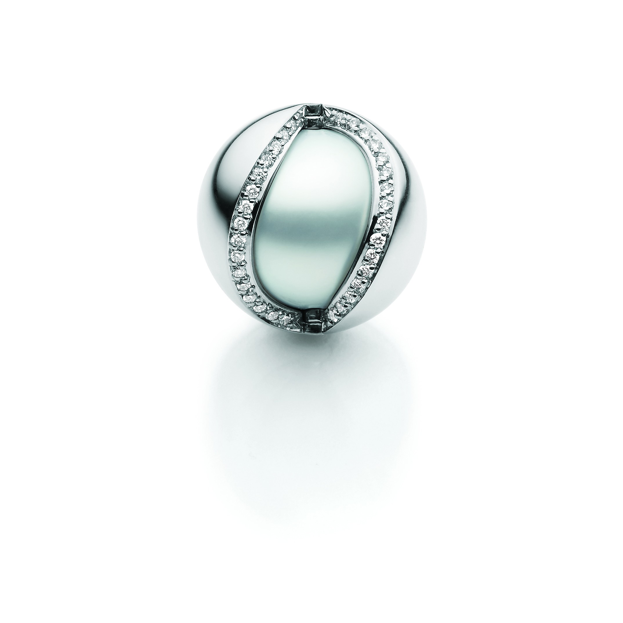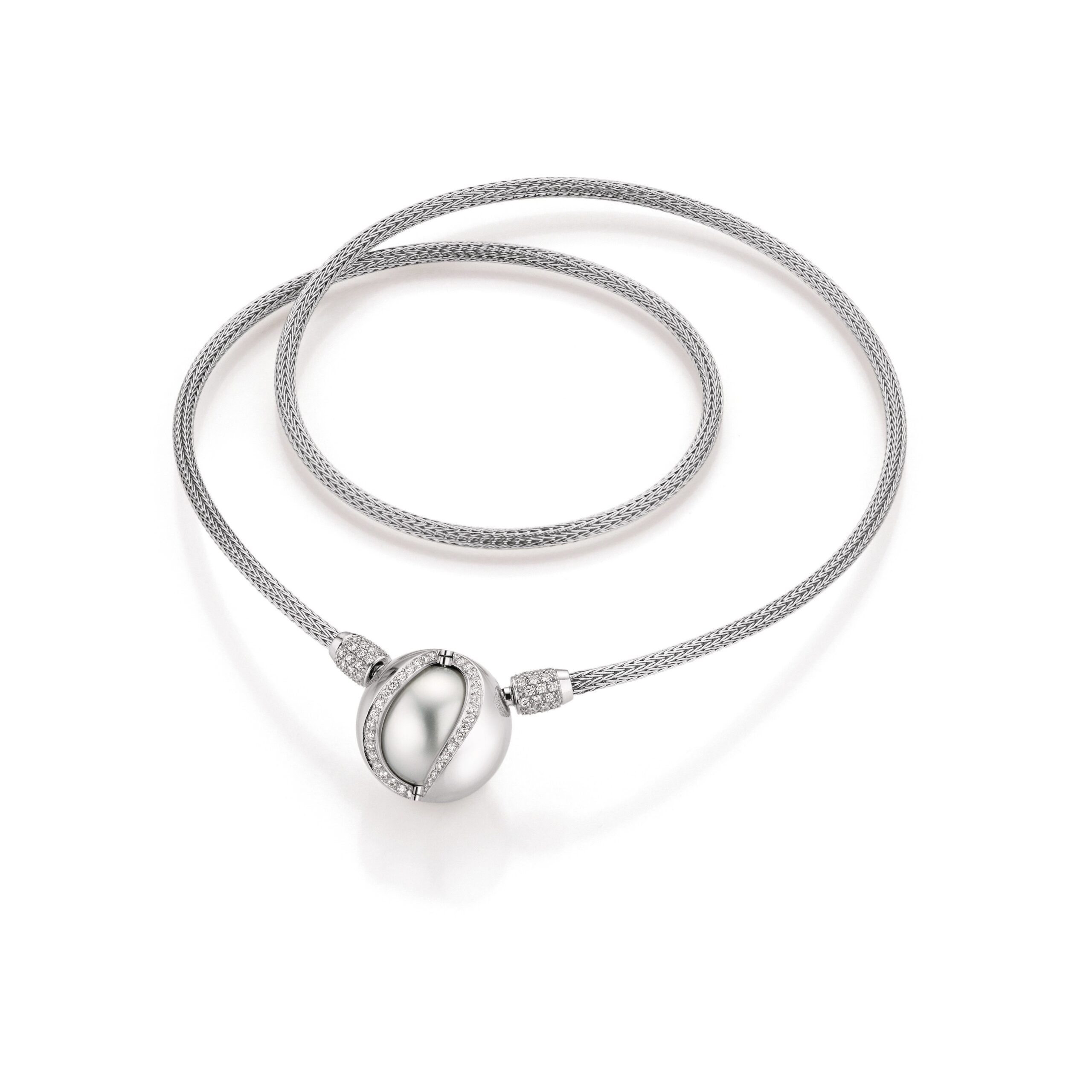 Ein Schauspiel der Verwandlung – Ein Innenleben mit Südsee-Zuchtperle, eines mit Brillant-Pavé. Ein saftes „Klick“, und die austauschbare und sich wandelbare Schmuckschließe erweist sich als faszinierender Geheimnisträger.